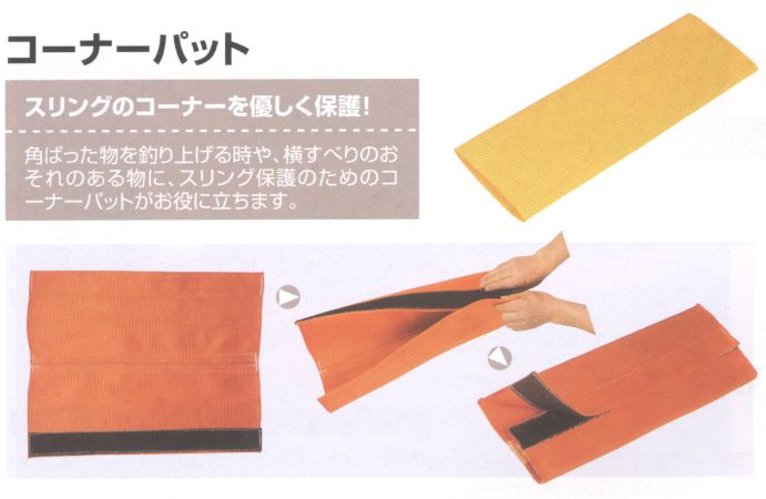 ■ベルトスリング 軽くてソフト。確実に吊り上げ! 合成繊維の中でも最も強靭なナイロン原糸を使用。 さらに独自の織り方で引張強度・弾性・耐久性・耐光性にすぐれ、力強くパワーを発揮します。 軽量で扱いやすく柔軟性にも優れているため、どんなつり荷にも確実にフィットし、折り曲げてもクセがつきません。 ■コーナーパット ■ボコパッド・ミキパッド