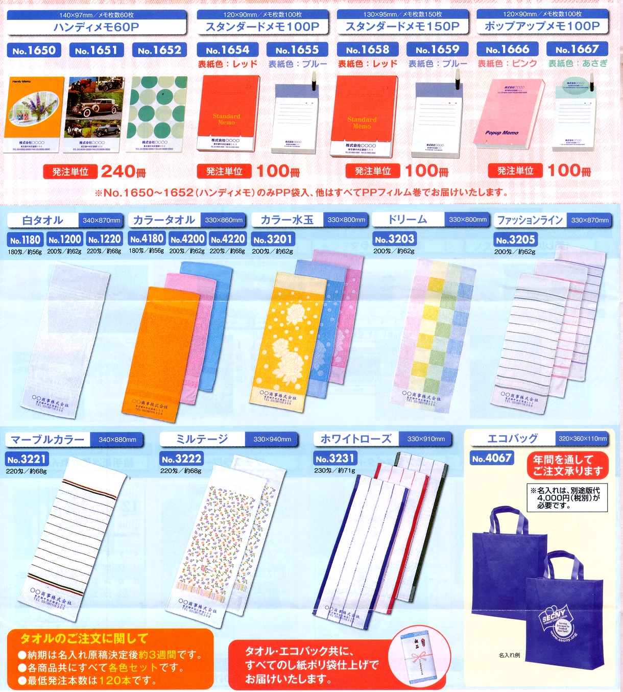 (メモ帳・タオルの名入れは紺1色です。)