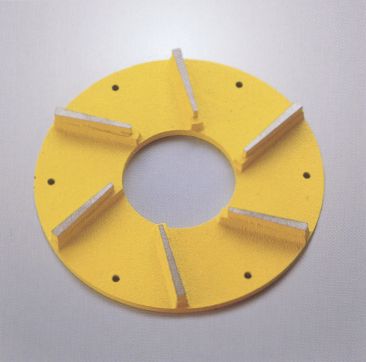 研磨機用 荒削りから中仕上げまでの工程で使用する台形チップを採用した工具で、フランジのダイキャスト製合金にチップを1個ずつねじ止めするタイプです。切れ味重視で硬い石の研磨に適しています。 |