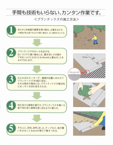 プランテックスは、デュポン社が開発した造園用ポリプロピレン・スパンボンド不織布です。しかも人や動物にはもちろん環境に影響を及ぼすことはありません。水や空気、肥料は通し、雑草の成育を抑制するもので、公園や街路をはじめ用途も広く、効率的な維持管理ができます。雑草が生えない環境つくりには、地球にやさしいプランテックスをご使用ください。