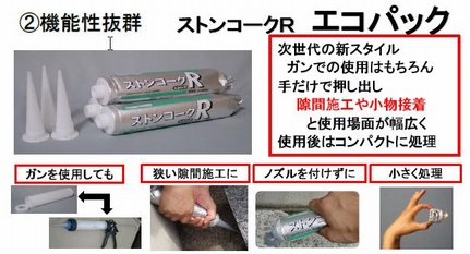 ・ボンドストンコークRは極めて弾力性に富んだ接着層を形成するため、温度変化、ショック、振動など様々な外部応力に対しても、長期にわたって粘り強い接着力を保持する信頼性の高い接着剤です。墓石建立時の接着、耐震防止接着、石材目地コーキング、石材防水に使用できます。