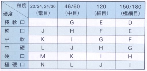 石材加工の作業は、必ず石材専用グラインダーをお使い下さい。 粒度・硬度表(ご注文の際は、下記の硬度をご指定下さい)